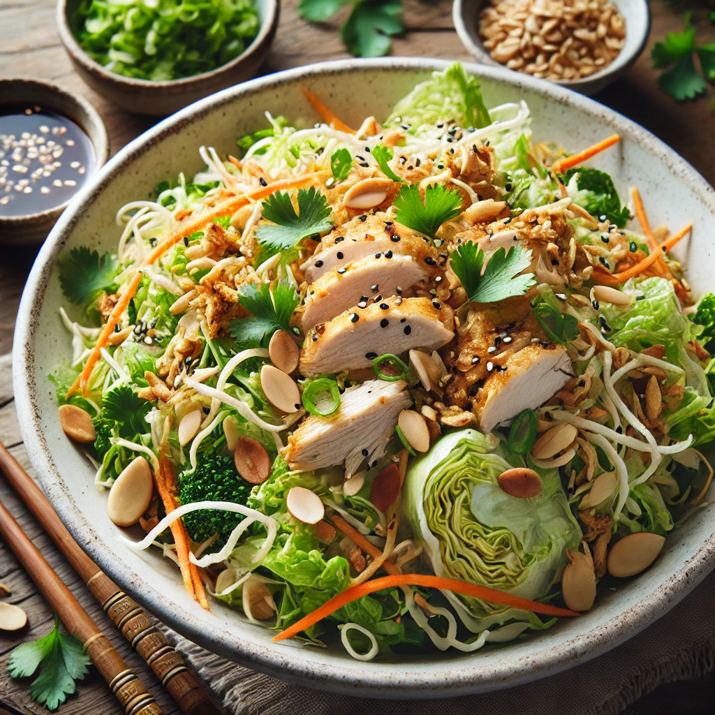 DALL·E 2025-01-17 13.52.32 - A beautifully presented Chinese chicken salad served in a large white bowl. The salad includes shredded chicken, finely chopped Napa cabbage, julienne