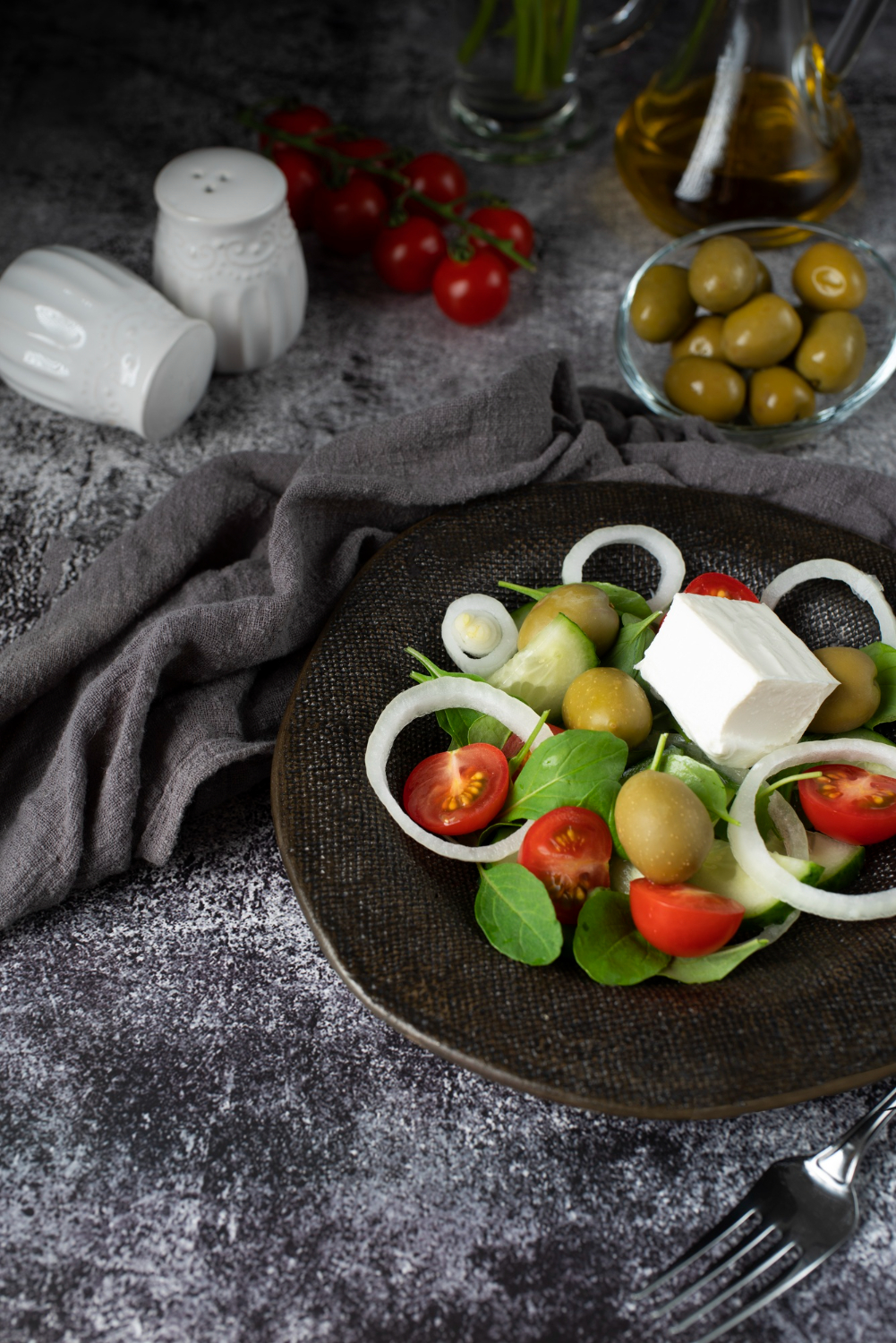 Salata s maslinama, lukom, paradajzom i feta sirom je jednostavno, osvježavajuće jelo koje se brzo priprema i idealno je za lagani obrok ili prilog. Ova kombinacija zdravih sastojaka poput maslina, feta sira, crvenog luka i paradajza pruža bogatstvo okusa, a ujedno i nutritivnu vrijednost.